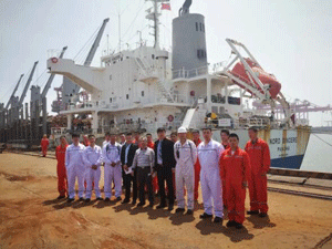 5月17日,信友公司青岛办事处谭龙经理,公司业务二部副经理邵毅,同16名船员兄弟共同前往日照岚桥港,与“MV NORD SINCERE”进行首次“会面”。