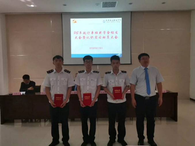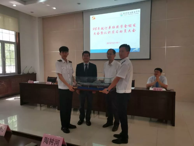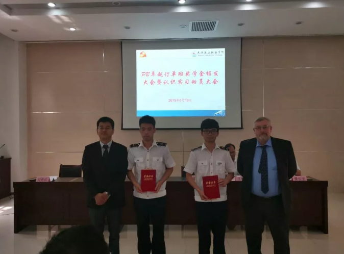 6月18日,香港PB公司人事总经理Capt. Bill Medcalf、中国区人事总经理何显波船长,天津海运职业学院校领导,公司刘总、费总、陶船长出席了PB卓越订单班奖学金颁发大会暨认知实习动员大会,以此激励同学们奋发向上,刻苦学习,以更饱满、更积极的态度去面对下半年的实习工作。三方领导为获奖同学颁奖。