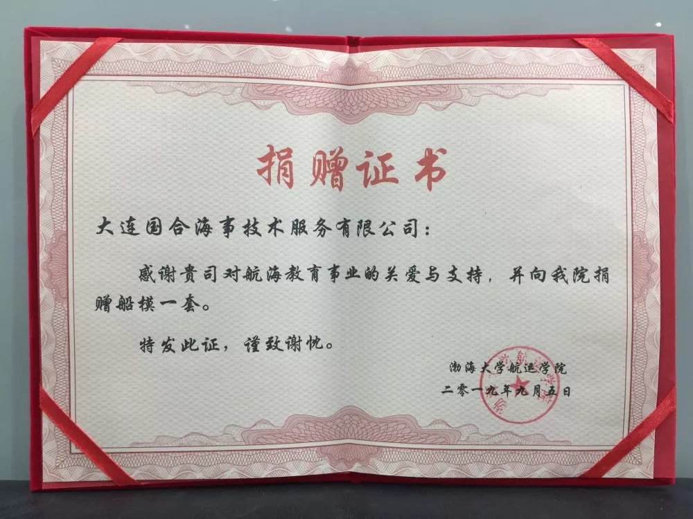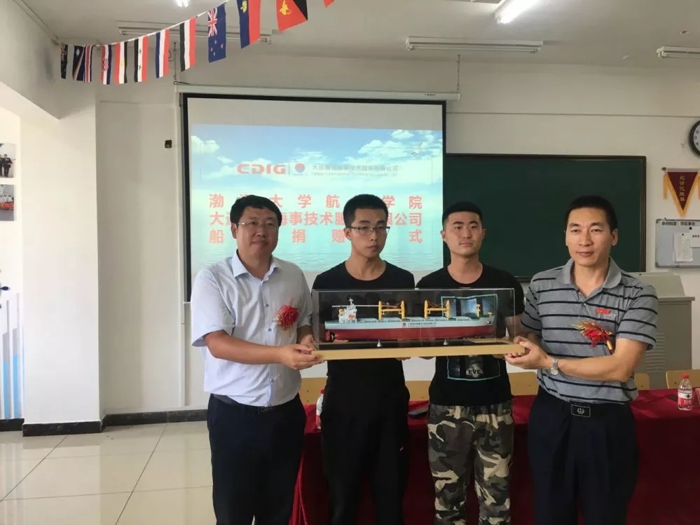 9月5日,公司为“海员主题文化教室”赠送船模,渤海大学航运学院举办“船模捐赠仪式”,学院副院长邵国余,院长助理杨昆永,以及公司副总经理费长宏,指导船长单继伟,经理助理刘雪梅,业务主管迟文刚出席了捐赠仪式。
