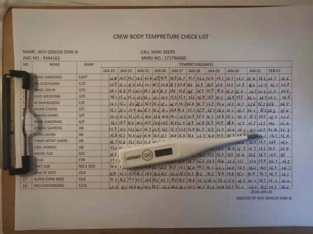 船上每天两次量体温记录
