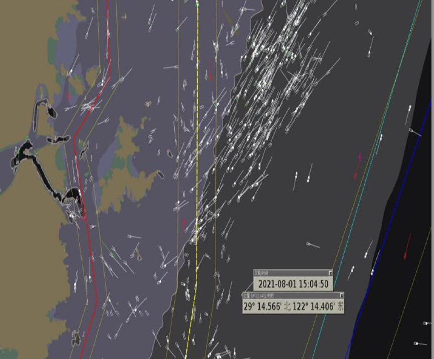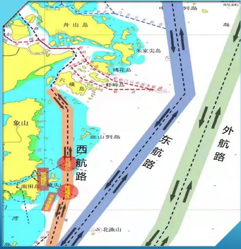 东航路特点:东航路(宁波段)自虾峙门口外深水航槽东侧,经象山沿海水域驶出宁波沿海,主要服务进出长江的船舶以及万吨级左右的南北航线船舶。相比于西航路和外航路,东航路具有船舶流量大、船舶种类多、渔船作业频繁的特点,且紧接虾峙门口外深水航槽、条帚门推荐航线,交汇态势纵横交错。
