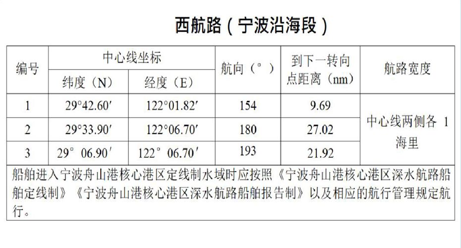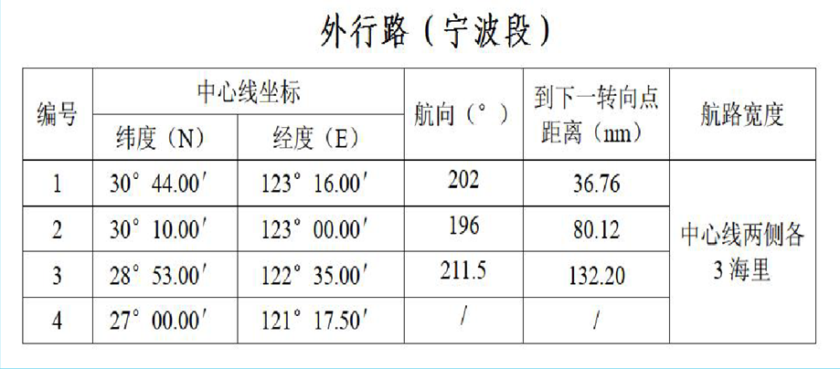 外航路:是中国沿海南北大通道的主航路,主要服务南北向航行的大型船舶。航路向北延伸与山东成山头船舶定线制衔接,向南延伸与福建沿海推荐外航路衔接。航路宽度为中心线两侧各3海里。其中:在舟山嵊泗海礁西侧水域设置了外航路支线,航路宽度为中心线两侧各
