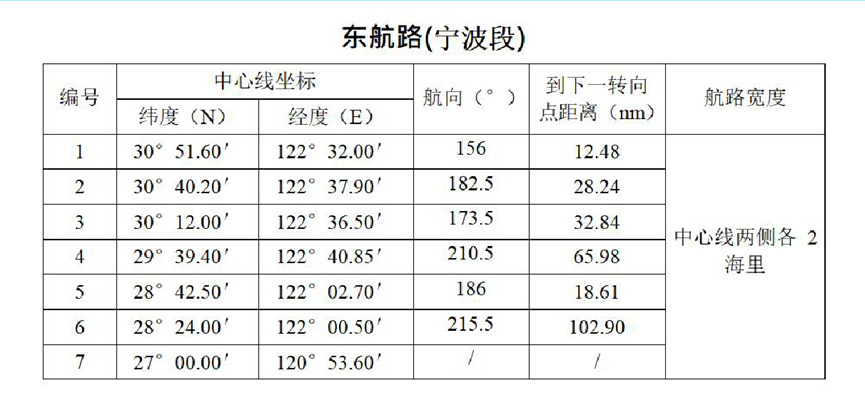 东航路:位于外航路和西航路之间,贯穿浙江沿海南北,主要服务于进出长江的船舶以及万吨级左右南北航线船舶。航路北段与长江口通航分道相接,南段与福建沿海推荐中航路衔接航路宽度为中心线两侧各2海里。其中,在舟山嵊泗列岛水域设置了东航路支线,航路北段与长江口南槽交通流支流衔接,南段在洋山港主航道汇入东航路,航路宽度为中心线两侧各1海里。