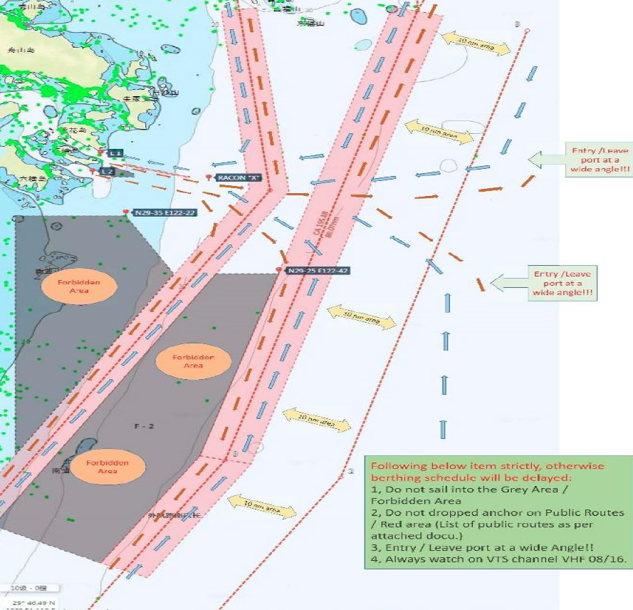 1.如果沿公共航路进出宁波刚,尽可能在29°37′N至29°43′N之间水域内调整航