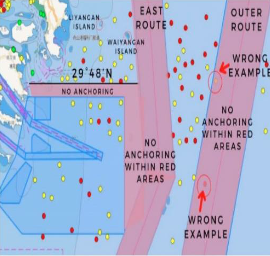 2.船舶在系统中没有靠泊或加油计划的,可以根据本船船位在29°48′N以北,122°43′E以东选择合适地点抛锚。