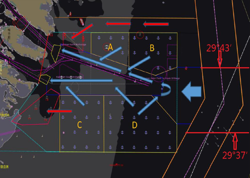 2.虾峙门进口,锚位在A锚地和B锚地区域内的,应该从深水航道北侧加入队列。