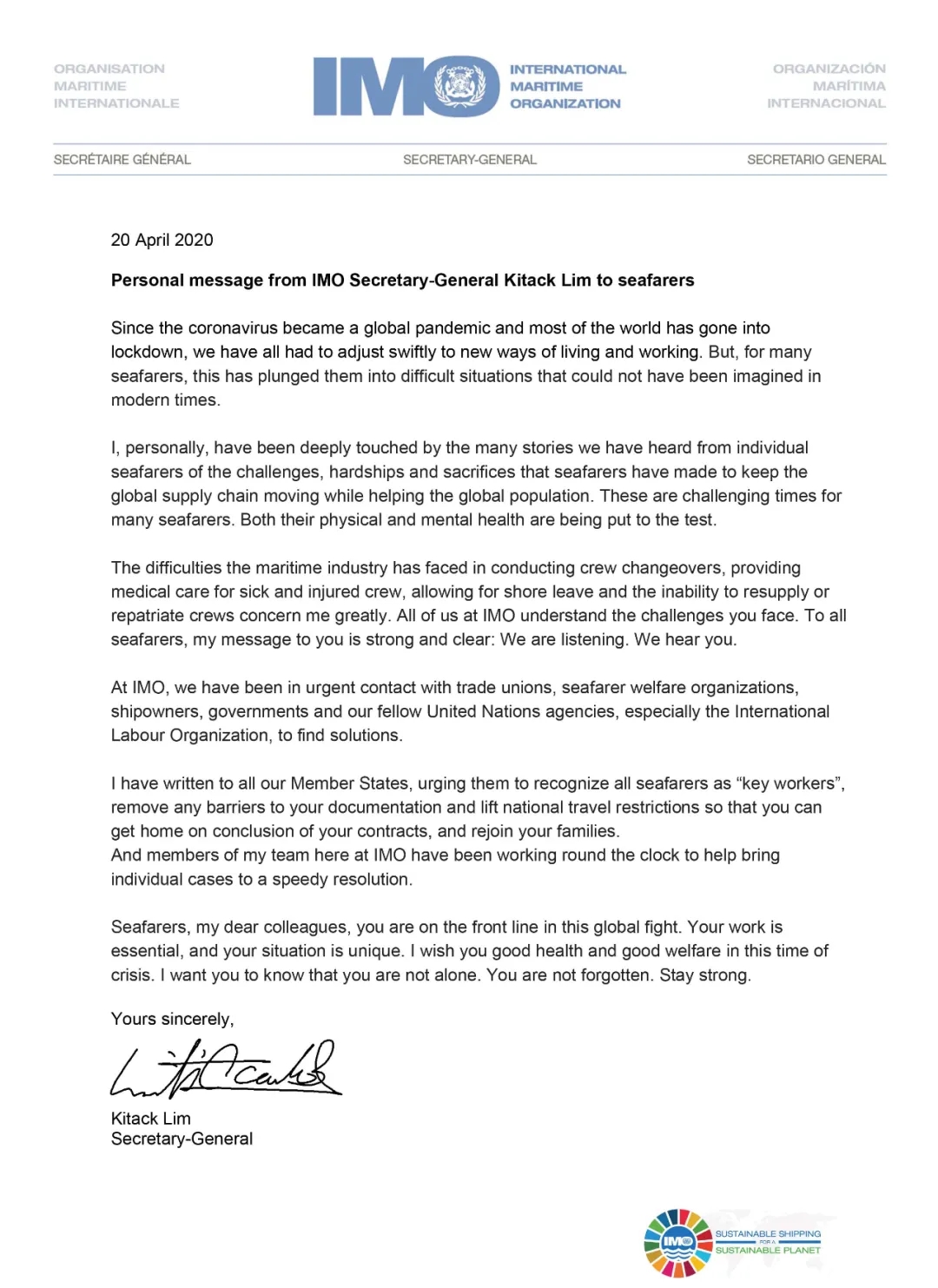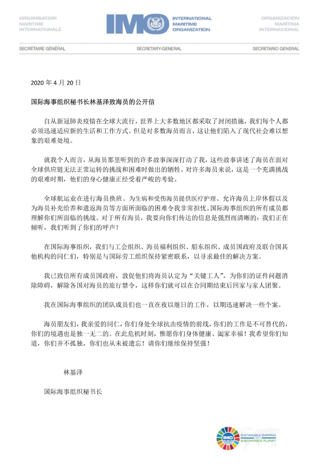 ——IMO秘书长林基泽先生4月20日向世界各地海员的致信